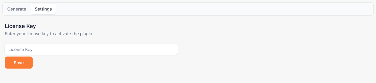 A text input field in the Settings tab where you enter and save your FastRender License Key. This key authenticates your plugin installation and enables access to the FastRender rendering service.